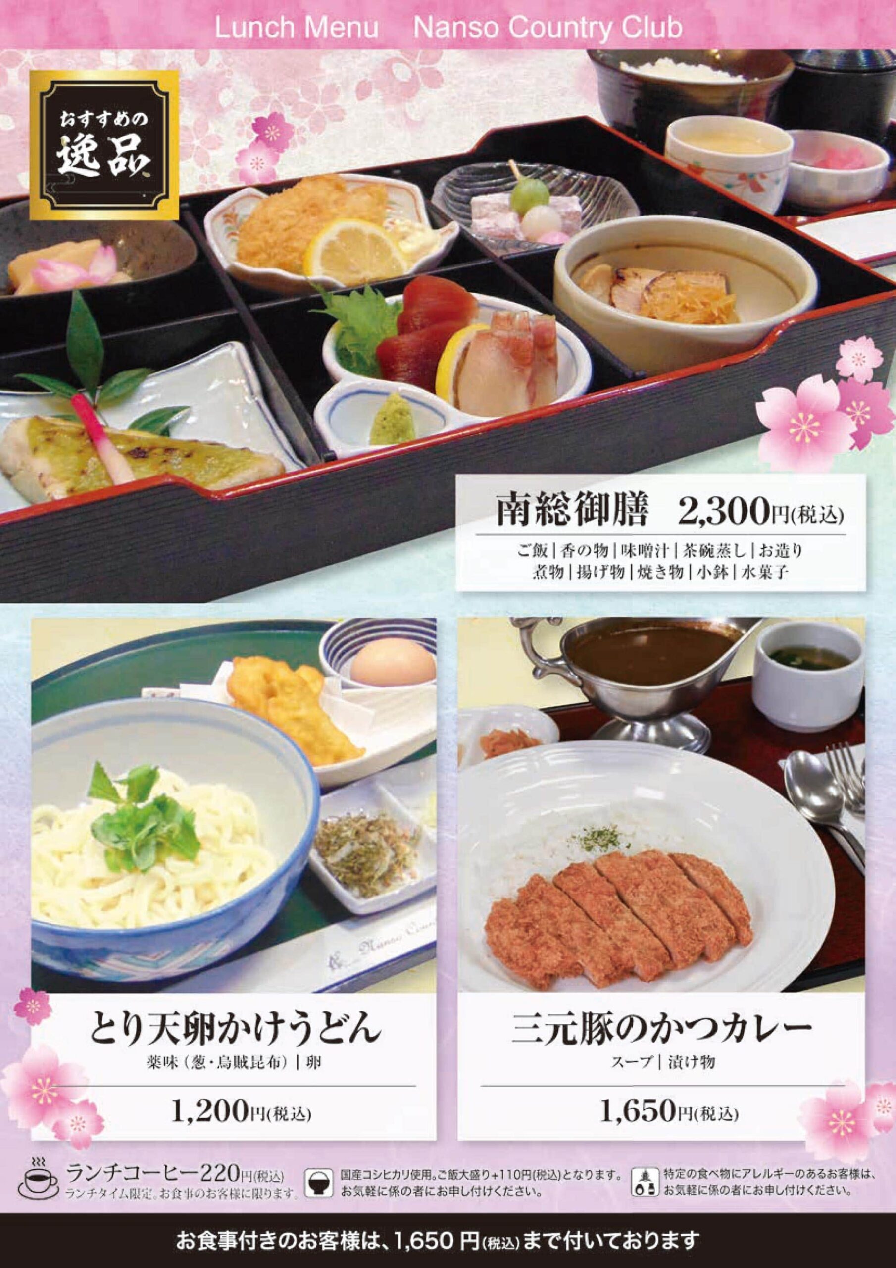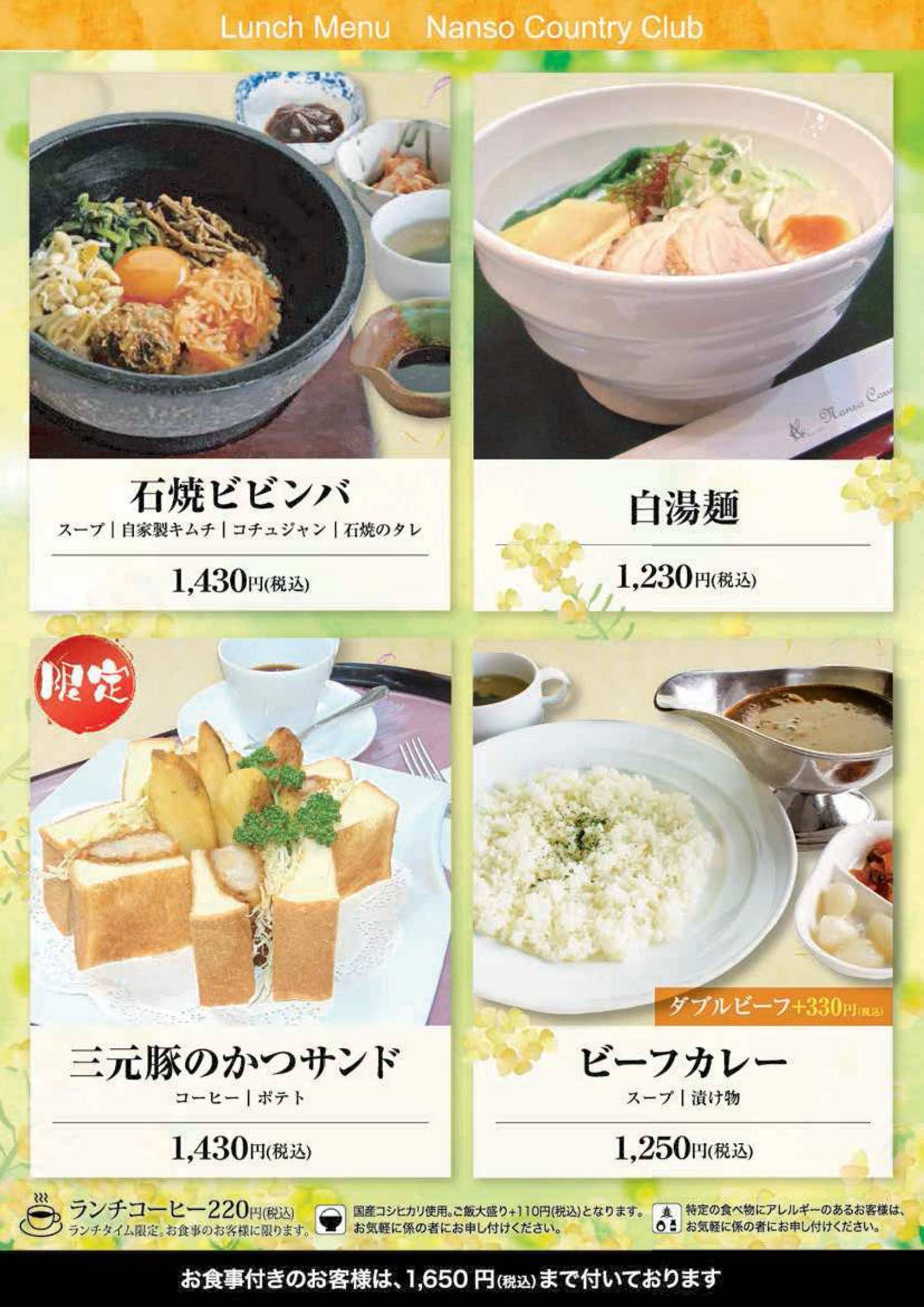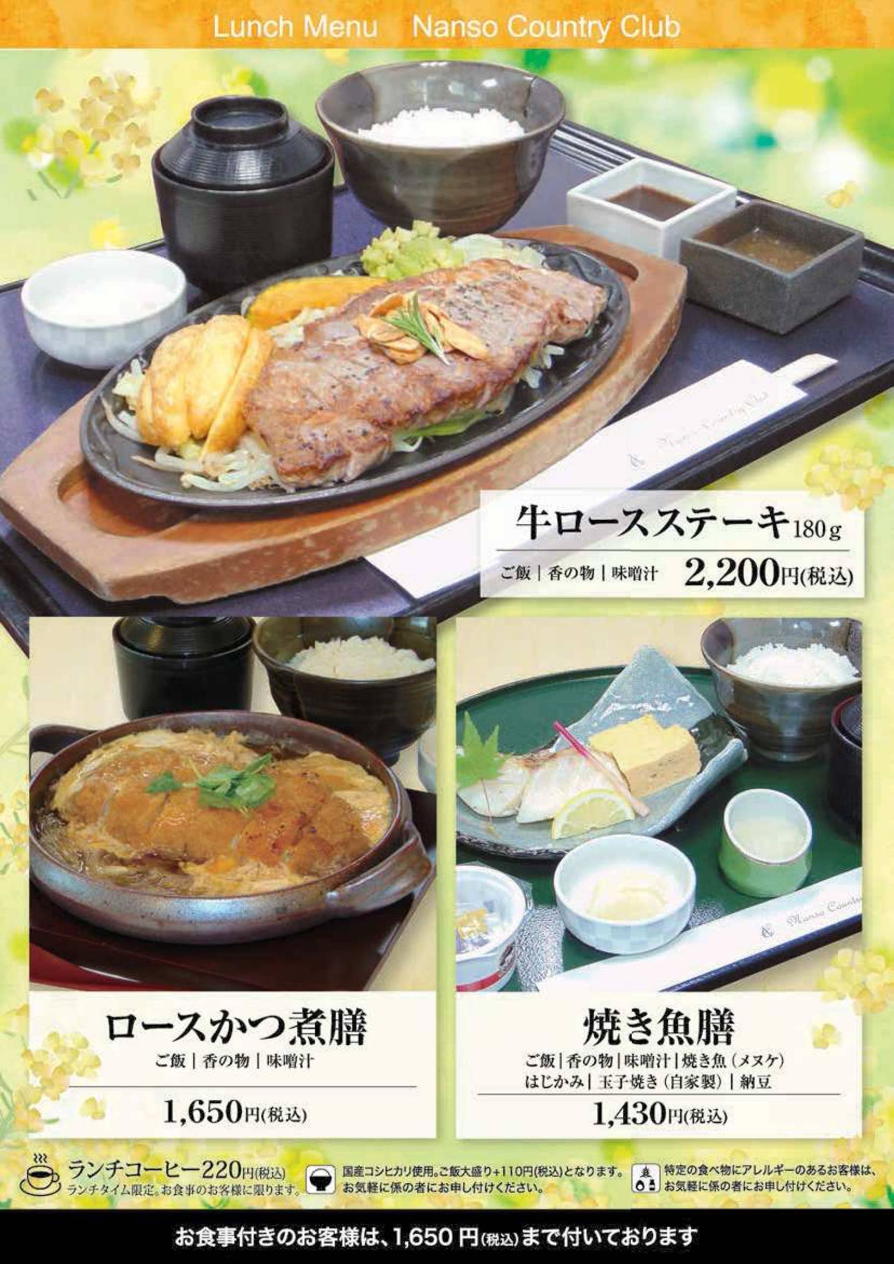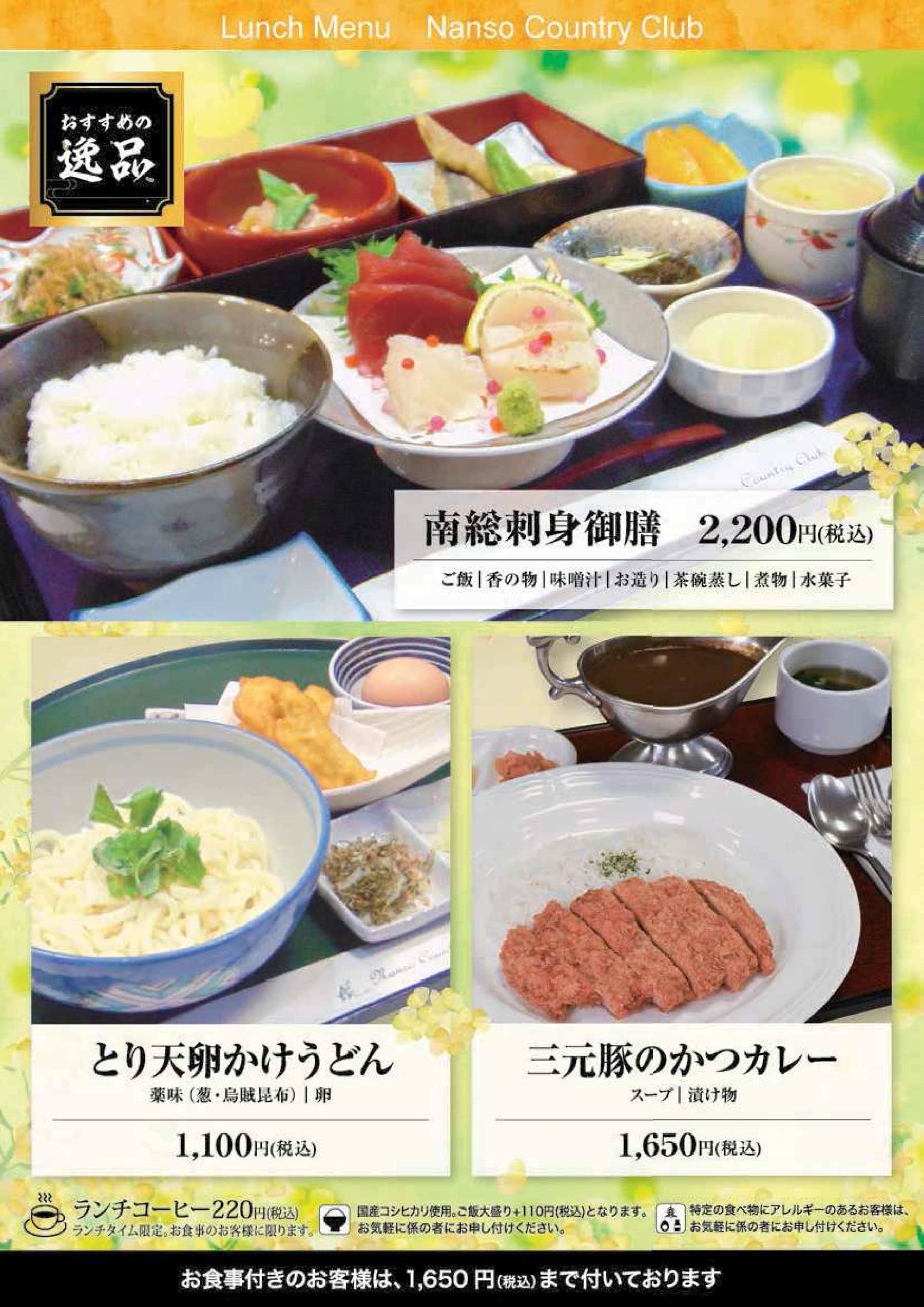 意見箱 ドレスコード 会員専用 ネット予約 © NANSO COUNTRY CLUB レストランRestaurant ホーム > レストラン ご予約・お問い合わせ オンライン予約 電話予約・お問合わせ メールお問い合わせ